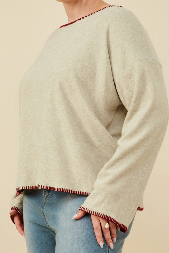 Experience cozy style with our Brushed Contrast Stitch Long Sleeve Top. Made from soft brushed knit fabric, this top features unique contrast stitch detailing that adds a modern touch. The round cut neckline ensures a flattering fit, making it a versatile piece for any wardrobe.
