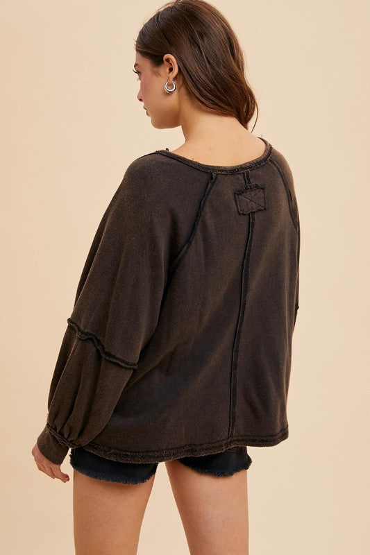 The Burnt Charcoal Mineral Terry Pullover offers a perfect blend of comfort and laid-back style. Made from soft cotton French terry fabric, it features a V-notched neckline and raglan sleeves for a relaxed, sporty vibe. The mineral washed finish gives it a lived-in feel, while the cuffed balloon sleeves add a trendy touch. With an oversized fit and side slit accents, this pullover provides effortless style and maximum comfort, making it a versatile addition to your casual wardrobe.