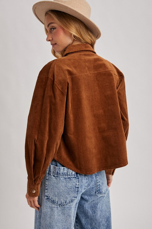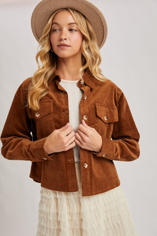 Add a touch of retro charm with a modern twist in the Camel Corduroy Cropped Jacket. Crafted from soft yet durable corduroy, this button-up jacket combines timeless texture with contemporary style. The cropped design gives it a fresh, flattering fit that pairs perfectly with high-waisted jeans or skirts for a chic, elevated look. Whether you're layering it over a simple tee or using it as a statement piece, this jacket effortlessly blends comfort, style, and versatility. A must-have for those who love classic styles with a modern edge.