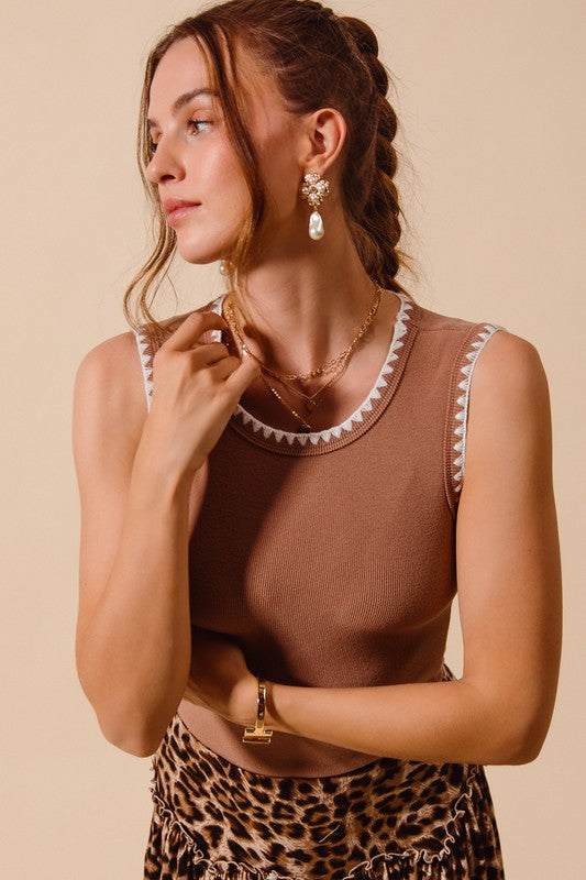 A closet essential with a twist. This ribbed, sleeveless tank features delicate contrast embroidery for a touch of charm. Soft, stretchy, and perfect for layering or wearing solo on sunny days.