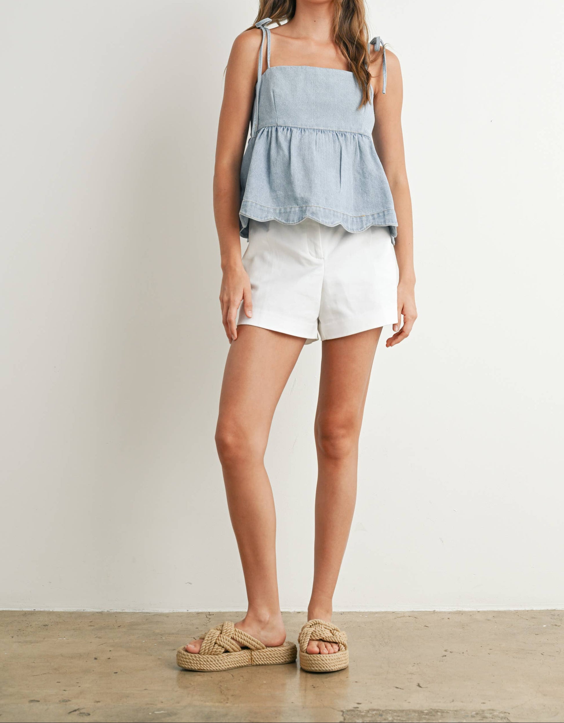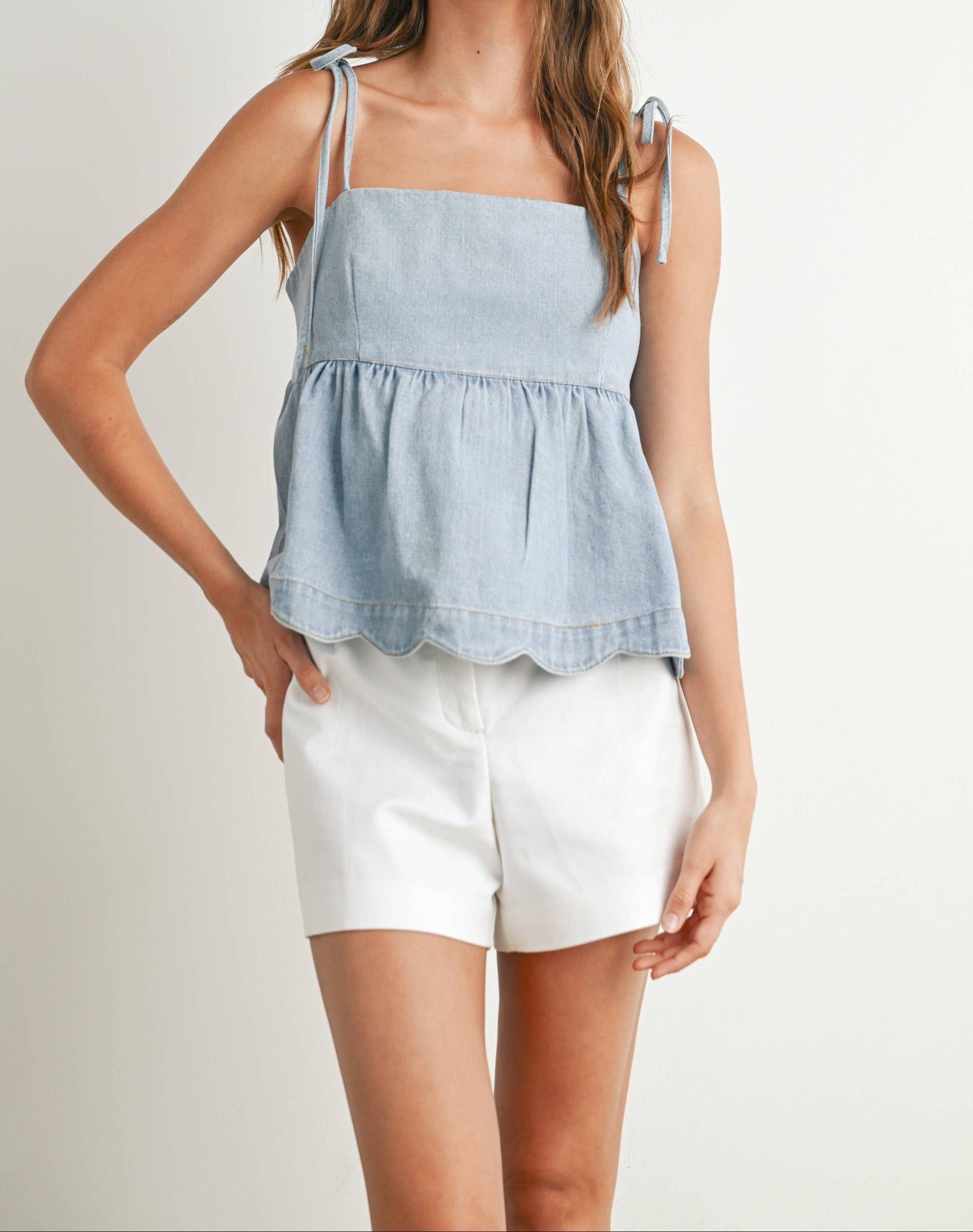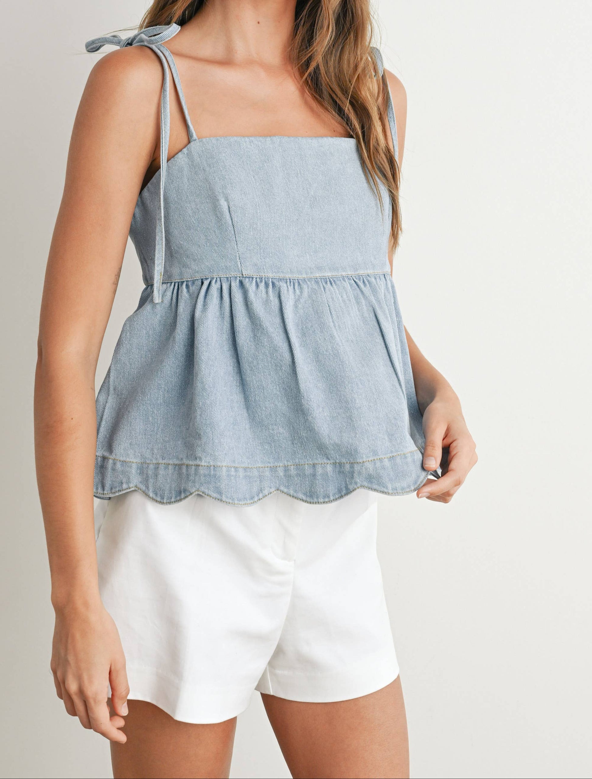 This charming denim tie strap peplum top combines casual style with feminine flair. Crafted from 100% cotton for breathable comfort, it features adjustable tie straps and a flattering peplum silhouette that cinches at the waist. The soft denim fabric offers a relaxed yet polished look that pairs beautifully with everything from jeans to skirts, making it a versatile addition to your warm-weather wardrobe.