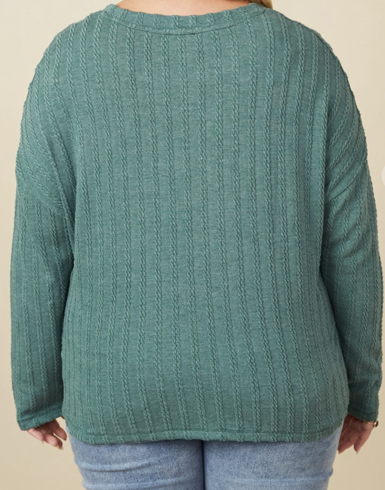The Green Cable Knit Banded Top is the perfect blend of texture, warmth, and style. Featuring a classic green cable knit pattern, this long-sleeve top brings cozy sophistication to your wardrobe. The modest round cut neckline and banded hemline add a flattering, structured finish, while the rich green color offers a timeless, earthy tone that pairs effortlessly with any season. Available in size inclusive options (1X-3X), this top is designed to provide both comfort and style for all body types. Whether dressed up or down, it's a versatile piece that adds a cozy, elevated touch to any outfit.
