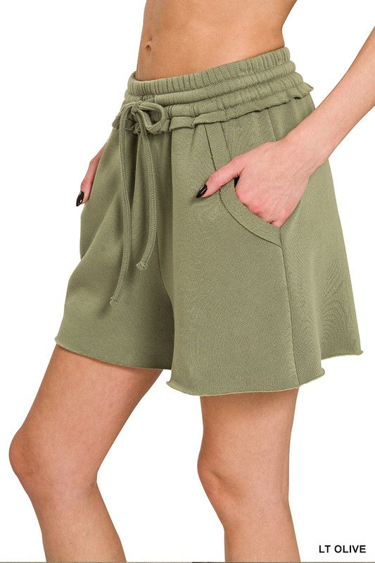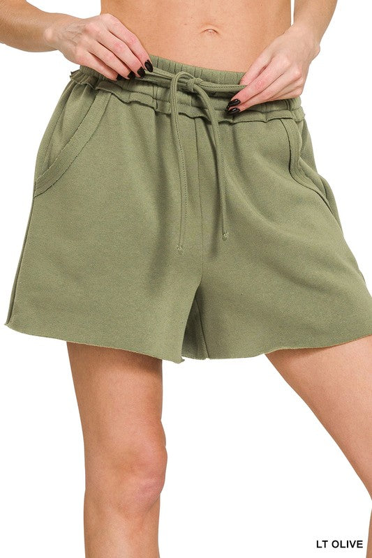 The Fleece Raw Hem Shorts with Drawstring are the perfect blend of comfort and casual style. Featuring raw edge details and a drawstring elastic waist, these shorts offer a relaxed and adjustable fit. With side pockets for added practicality, they are as functional as they are stylish. The relaxed waist measures approximately 25.5" and the inseam is 4", making them ideal for lounging or casual outings. Soft and cozy, these shorts are a must-have for laid-back days.