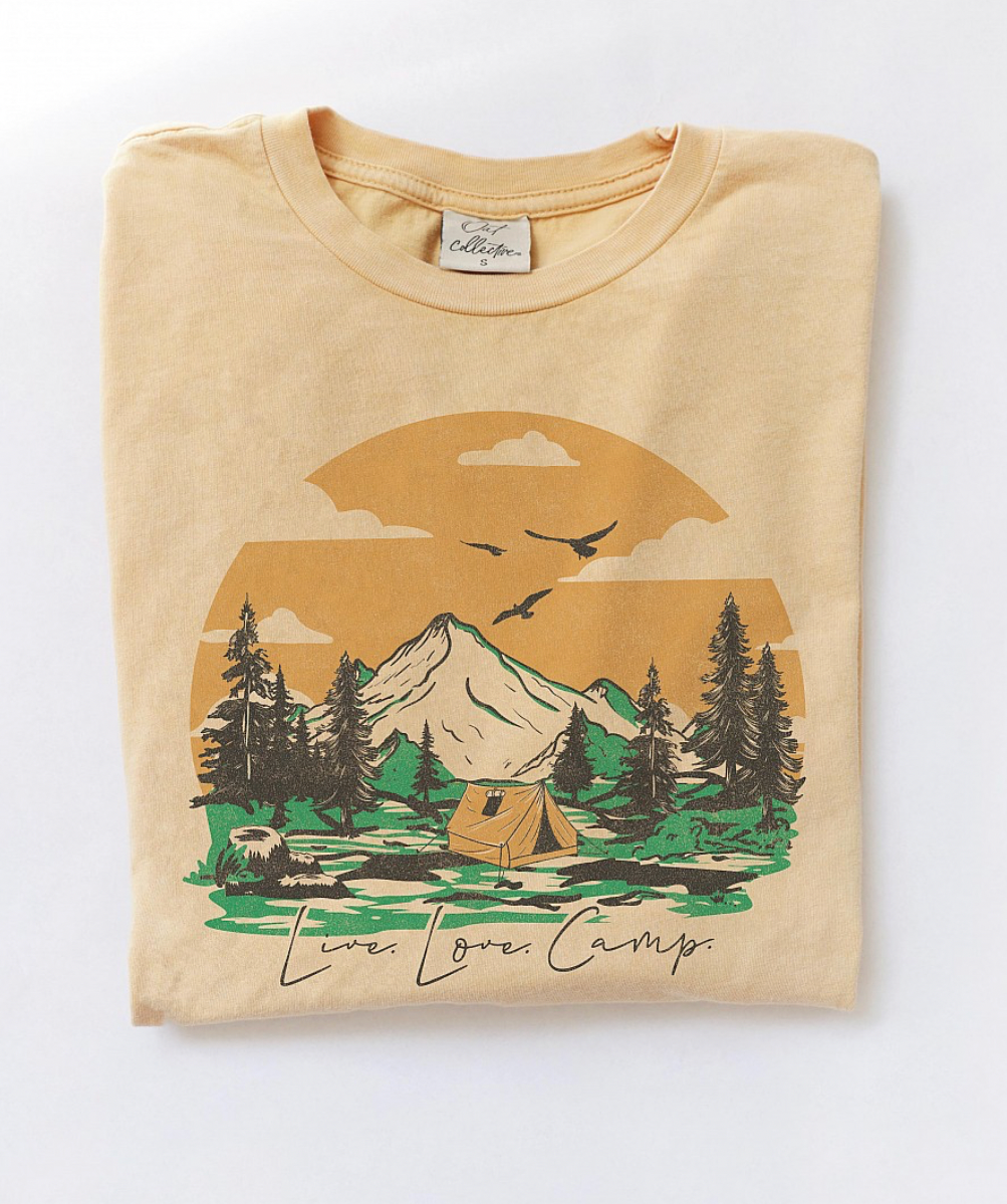 This fun "Live, Love, Camp" tee comes in this beautiful mustard color and is perfect for outdoor enthusiasts and camping lovers. The soft, comfortable fabric and relaxed fit make it ideal for campfire nights, hiking adventures, or everyday wear when you're dreaming of your next outdoor escape. A must-have for anyone who lives for those moments under the stars.