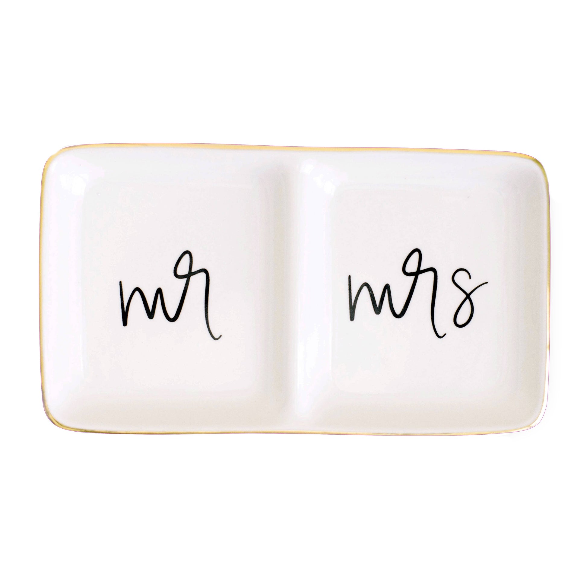 DETAILS: • Gold Foil Design • Hand Lettered Design: Mr Mrs • 7.2 x 4” Rectangle Dish • Ceramic Jewelry Dish • Color: Cream and Gold • Designed in the USA, Imported • Style No. JD019 CARE: • Not Intended for Food Use • Not Microwave and Not Dishwasher Safe • Use a Soft Cloth and Water to Clean