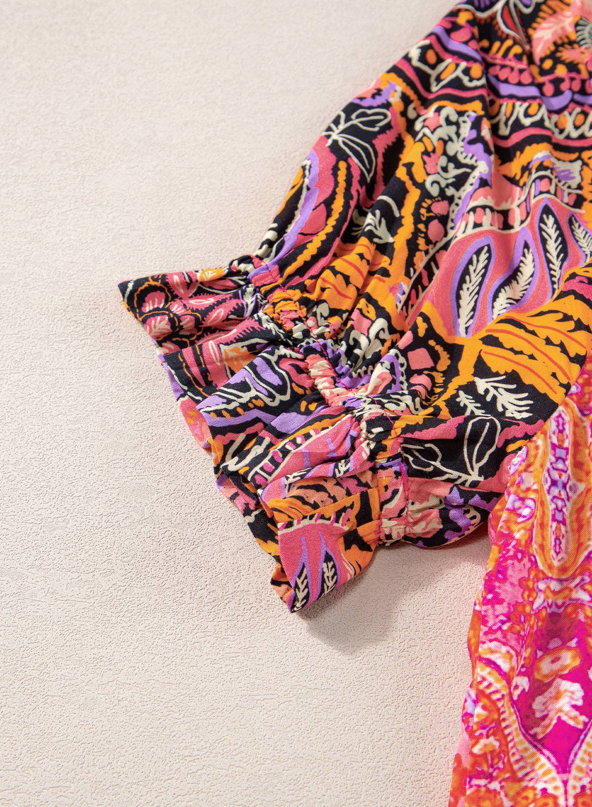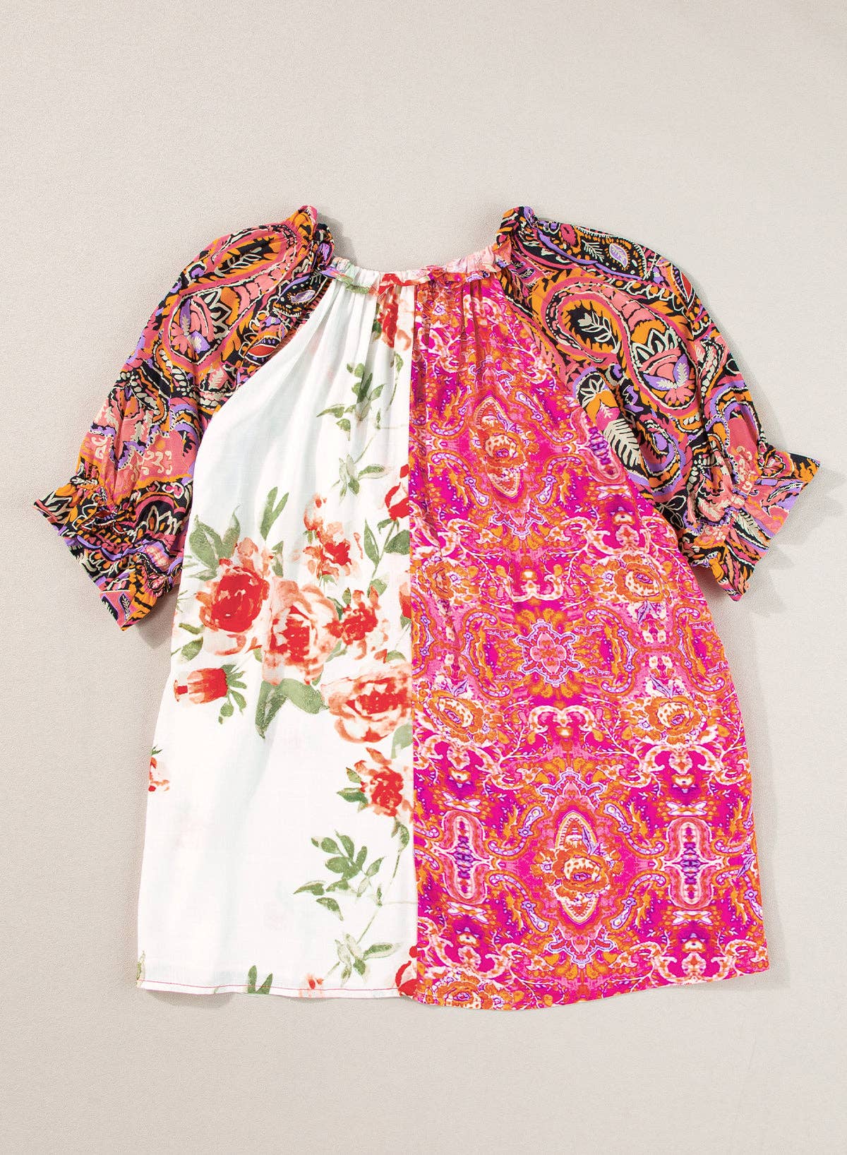 This boho patchwork short sleeve blouse brings vibrant, free-spirited style to your wardrobe with its colorful floral patchwork design. The charming button-front detail and relaxed fit create an effortlessly bohemian look that's perfect for festivals, beach days, or adding a touch of artistic flair to your everyday style.