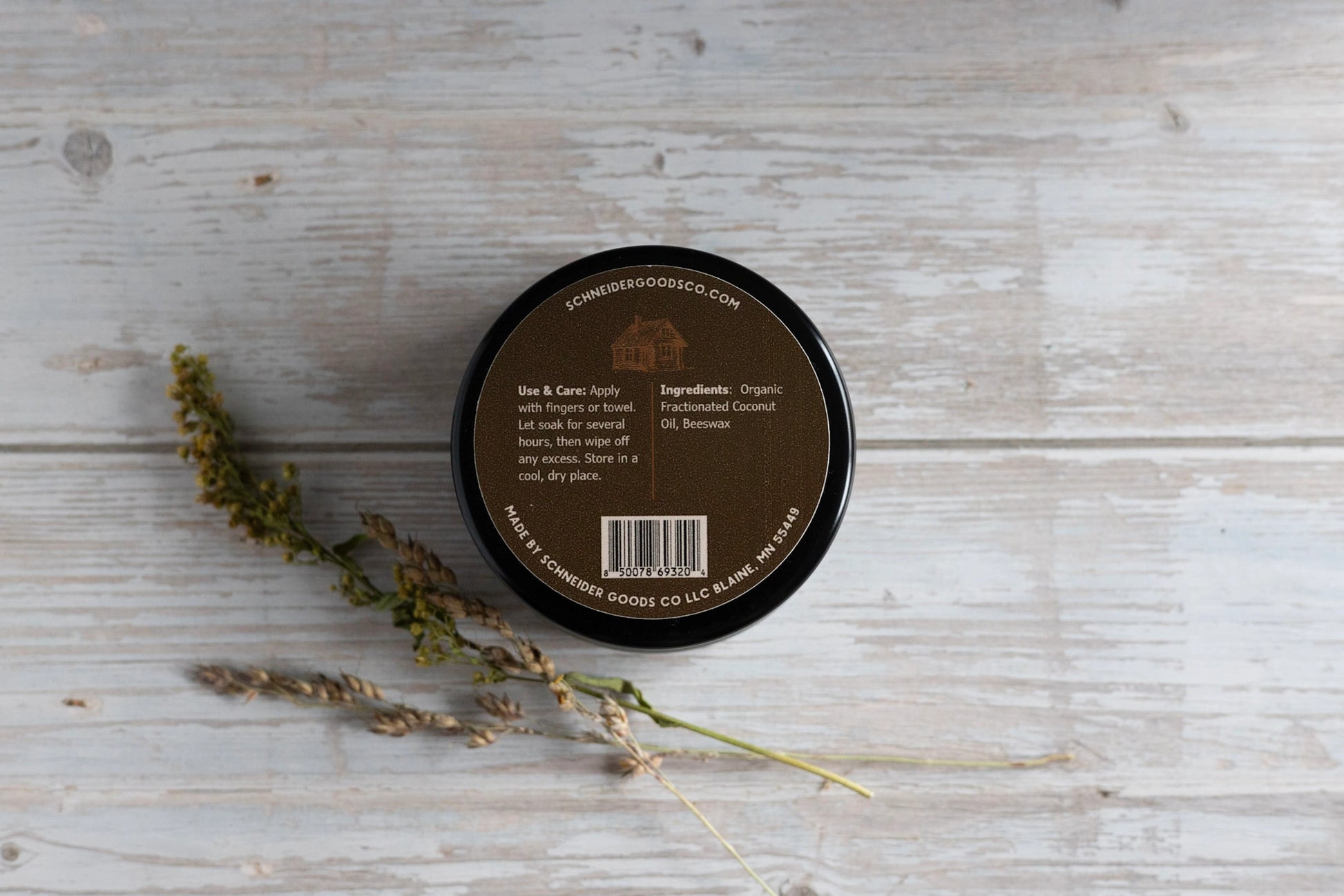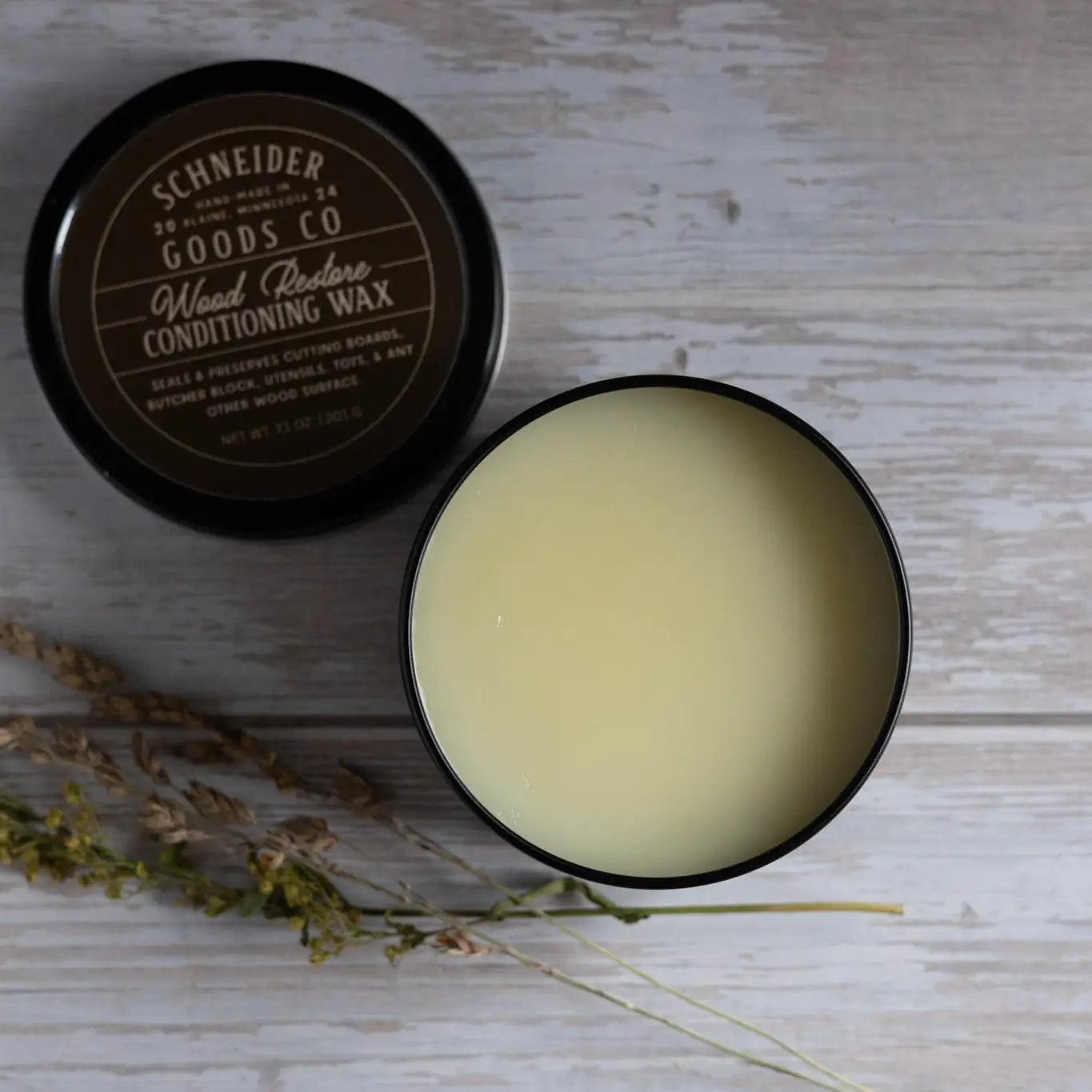 Keep your wooden items in beautiful condition with our Wood Restore wax. Most cutting board conditioners and oils contain mineral oil, a product made from petroleum. Instead, we use organic fractionated coconut oil (highly shelf-stable) and beeswax to create an effective moisturizer for your kitchen and household goods. Try it on cutting boards, wooden utensils, butcher block, wooden toys, and any other wooden goods in your home! To use, coat the entire surface using your fingers, paper towel, or a cloth towel. Let it soak in for several hours, then repeat again if needed. Wipe off any excess. Repeat this conditioning process when the wood starts to look dry. Store in a cool, dry place.